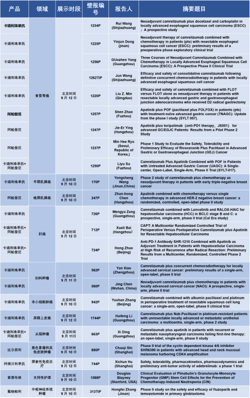 此外,在其他领域,达尔西利、氟唑帕利,以及未上市创新产品人源化抗PD-L1抗体阿得贝利单抗、微管蛋白抑制剂普那布林等产品相关研究入选了4篇壁报,下表为具体壁报编号及展示时间,让我们一起相约,见证多项研究成果公布。