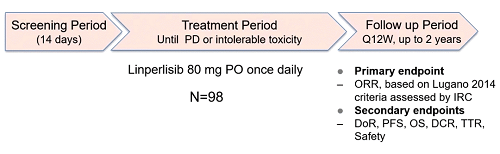 主要终点为客观缓解率ORR(独立审查委员会根据Lugano2014标准评估),次要终点为缓解持续时间(DoR),无进展生存期(PFS),总生存期(OS),疾病控制率(DCR),至缓解时间(TTR)及安全性。