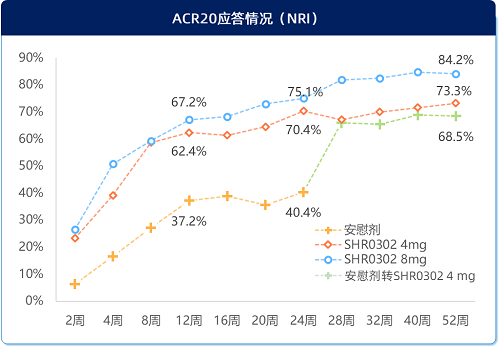 接受艾玛昔替尼治疗后,疾病缓解和低疾病活动的患者比例显著增加,且持续至52周,8mg组DAS28-CRP<2.6患者比例为50.3%, DAS28-CRP≤3.2患者比例为70.2%(图3)。