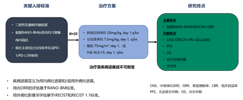 研究主要终点为根据RANO-BM标准评估的中枢神经系统客观缓解率(CNS-ORR),次要终点包括中枢神经系统临床获益率(CNS-CBR)、无进展生存期(PFS)、总生存期(OS)、首次进展位置及安全性。