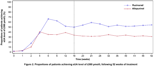 在为期16周的核心治疗期后,鲁兹诺雷钠片组39.7%的患者最后两次sUA水平≤360 μmol/L(临床达标阈值),显著高于对照组的26.5%(治疗差异13.1% [95% CI, 6.6%-19.7%];单侧p<0.0001)。第16周时sUA≤360 μmol/L的患者比例在鲁兹诺雷钠片组更高(52.6% vs. 34.5%;单侧p<0.0001),且疗效优势在52周的扩展治疗期中持续保持(鲁兹诺雷钠片组54.2% vs. 对照组31.0%;图2)。