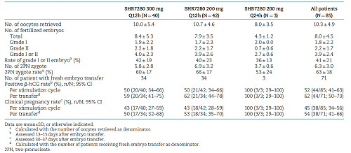 研究共入组85例符合体外受精-胚胎移植或卵胞浆内单精子显微注射技术指征的不孕症女性受试者,其中40例接受300 mg BID给药,42例接受200 mg BID给药,3例接受200 mg QD给药(1例受试者出现早发LH峰)。