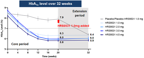 研究包括20周的核心治疗期和12周的延伸治疗期。主要终点是第20周时HbA1c较基线的变化。在延伸治疗期间,HRS9531各组的剂量保持不变,而安慰剂组则增加HRS9531注射液1 mg每周一次给药(安慰剂-HRS9531 1 mg/w组)。主要终点的结果已经在2024年欧洲糖尿病研究协会年会(EASD)公布[3],本次报告主要聚焦延伸期治疗32周后的有效性和安全性。