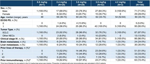 本研究是一项多中心、开放标签的Ⅰ期临床研究(NCT06443489,图1),纳入经组织学或细胞学确诊的复发性或转移性SCLC及其他DLL3表达阳性的NEC患者(经标准治疗后疾病进展或复发)。