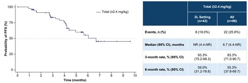 ≥2.4mg/kg剂量组的总体治疗人群(n=86)的中位无进展生存期(PFS)为6.7个月,6个月PFS率为55.3%;二线治疗人群中(n=42)的中位PFS尚未达到,6个月PFS率为59%(图5)。